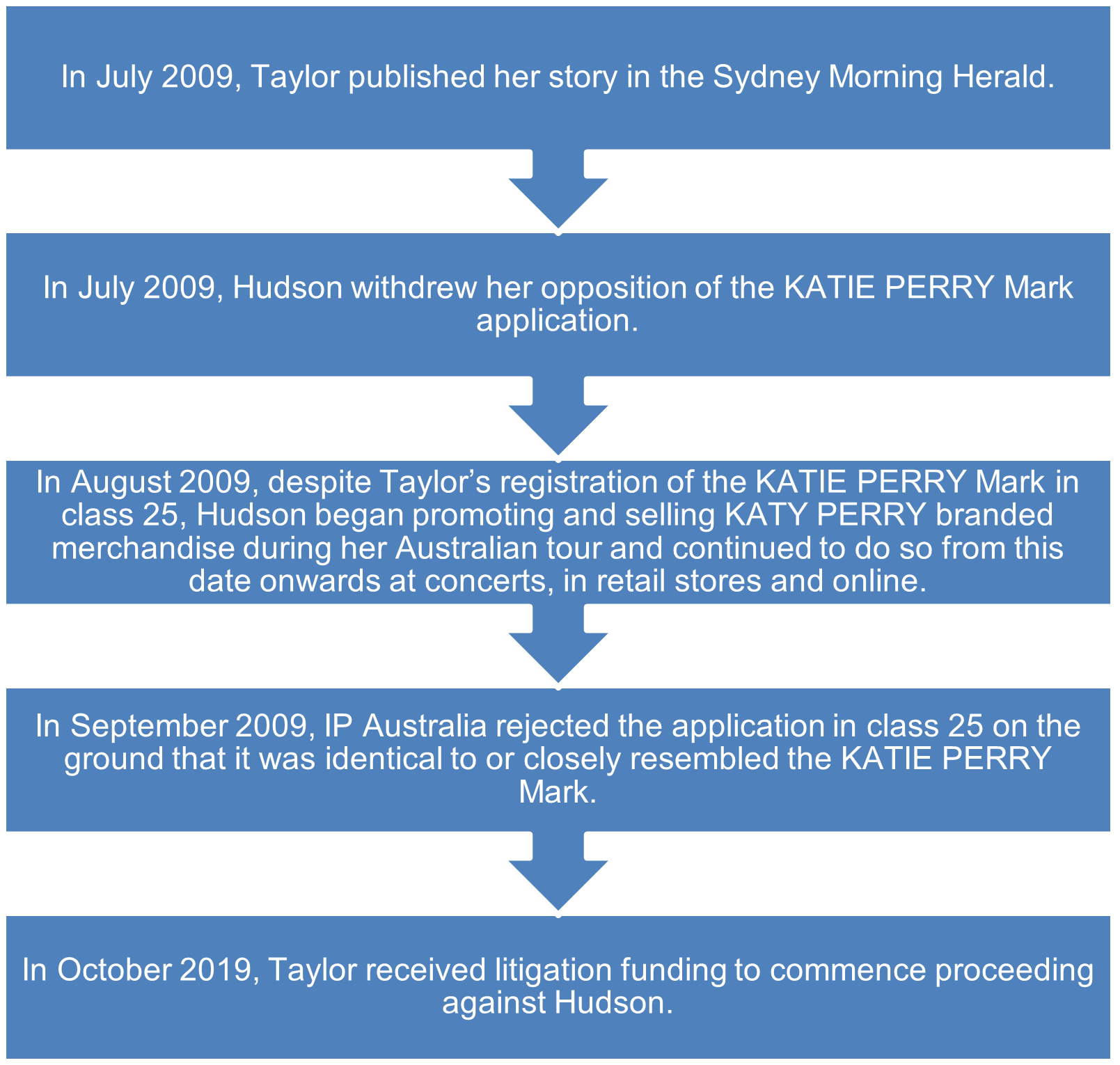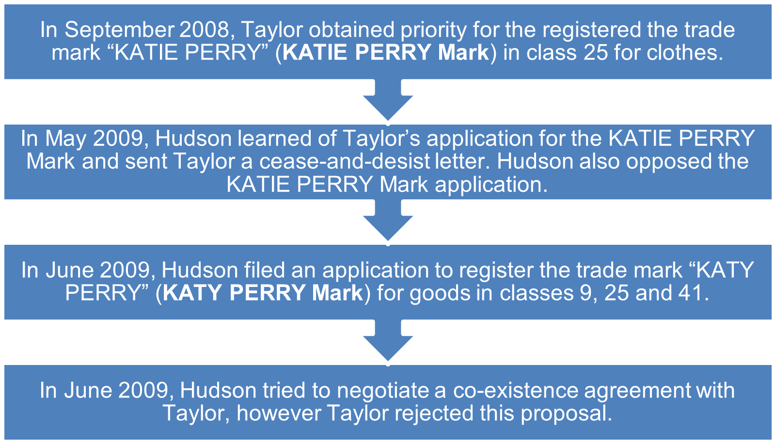 Taylor bought proceedings against Hudson and the Associated Companies alleging that the respondents had infringed the KATIE PERRY Mark pursuant to s 120 of the Trade Marks Act 1995 (Cth) (Act) by using the KATY PERRY mark which is substantially identical with, or deceptively similar to, the KATIE PERRY mark in the promotion and sale of clothes or goods of the same description.